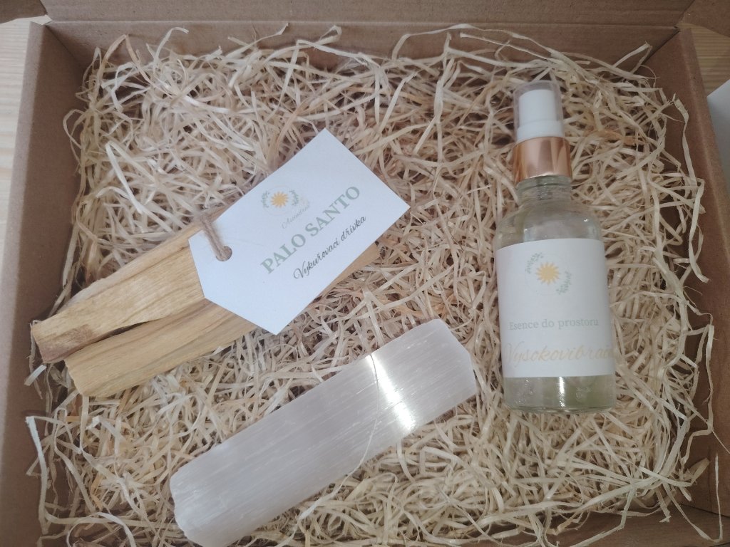 Součástí sady je selenit, který je tradičně využíván jako harmonizační kámen a může sloužit jako klidný doprovod při práci se záměrem, Palo Santo, přírodní dřevo používané pro jemné vykuřování a navození příjemné atmosféry, a harmonizační esence do prostoru, která obsahuje esenciální oleje, líh a destilovanou vodu a je určena k jemnému provonění prostoru a podpoře pocitu čistoty a lehkosti.